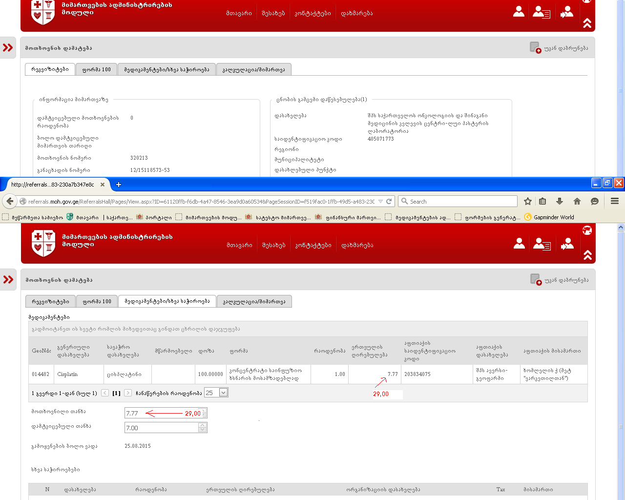 კომისიაზე დამტკიცებულ მიმართვებში გვინდა მონაცემების კორექტირება. რეკვიზიტებში და კალკულაციაში მითითებული დაწესებულება ერთმანეთს არ ემთხვევა და ამის გამო საგარანტიო იბეჭდება არასწორად, თხოვნა გვაქვს რომ დაგვიკორექტიროთ. გიგზავნი მოთხოვნის ნომრებს და სქრინებს..