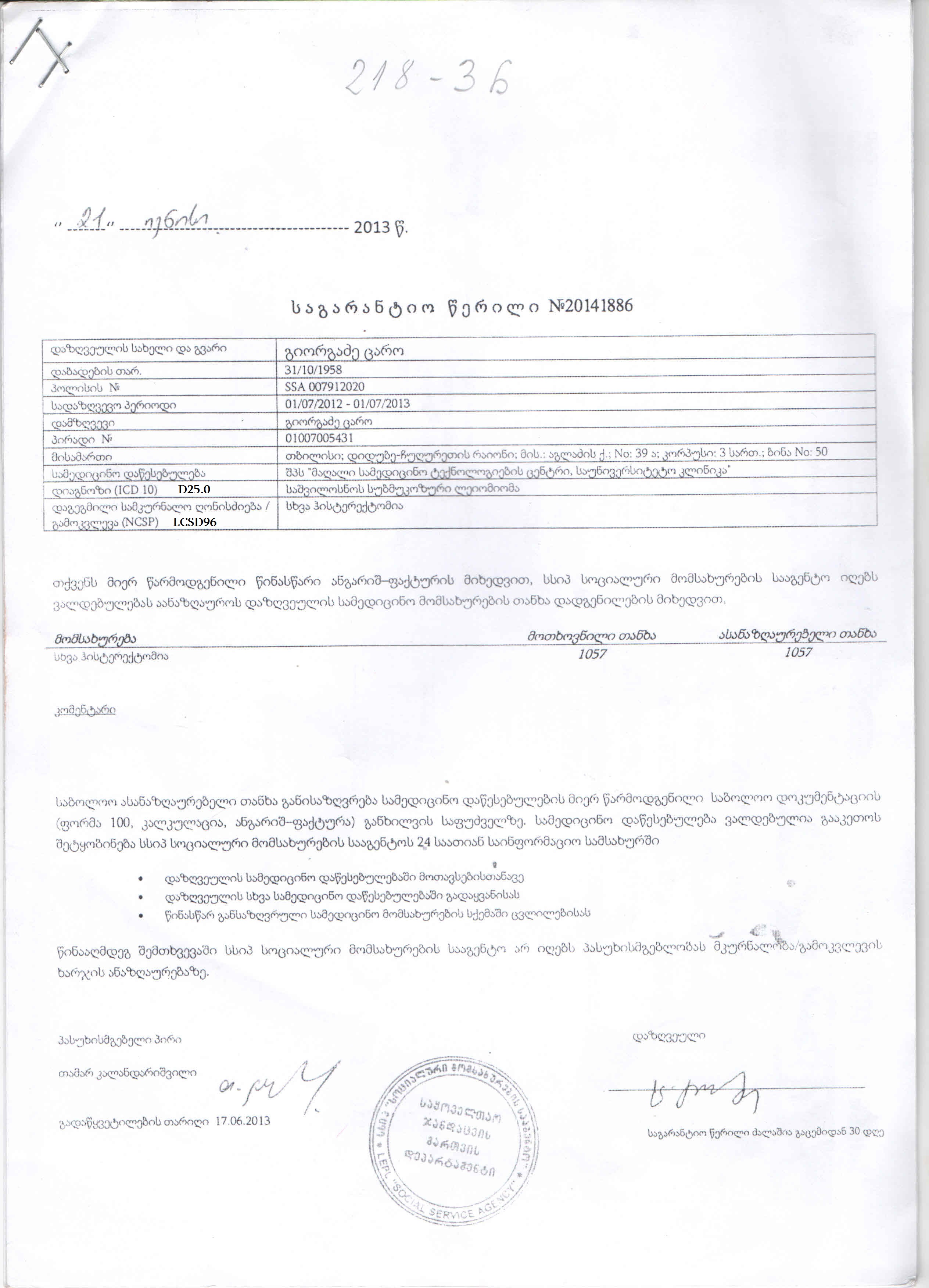სახ. პროგრამით ასანაზღაურებელი თანხა - 1057 ლარი.