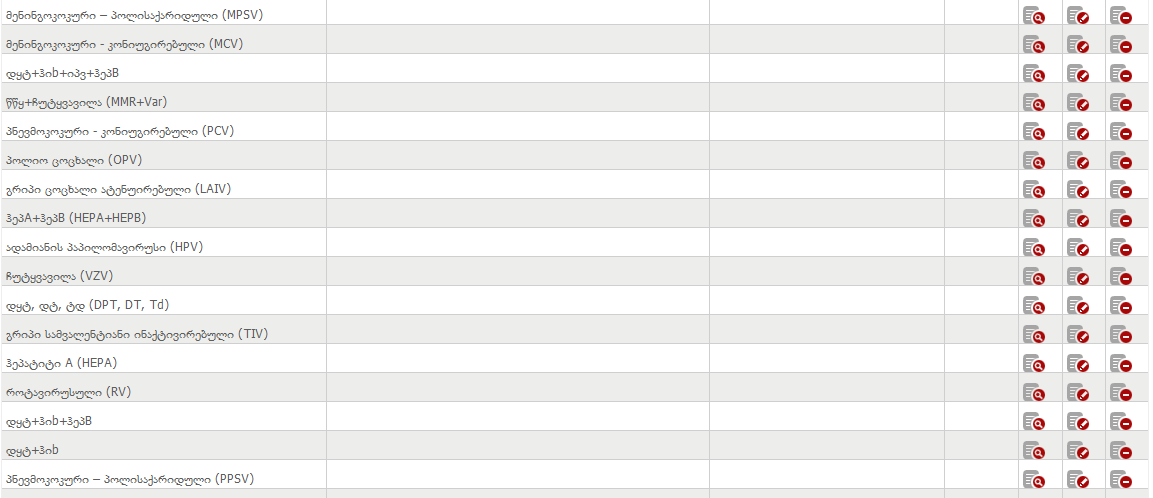 1. თამთამ გამომიგზავნა ამ ვაქცინების სია, კარგად ვერ გავიგე რა უნდა , მგონი დასახელებების ფორმატში არის ცვლილებები შესატანი, შესაძლოა ზოგი ვაქცინა საერთოდ არც უნდა არსებობდეს