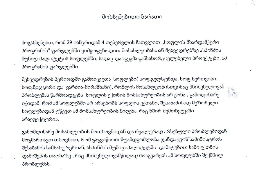 გიგზავნით ასპინძის საოლქო ორგანიზაციის თავმჯდომარის როსტომ მაგრაქველიძის მიერ მოწოდებულ მოხსენებით ბარათს (იხ. მიბმული ფაილი).