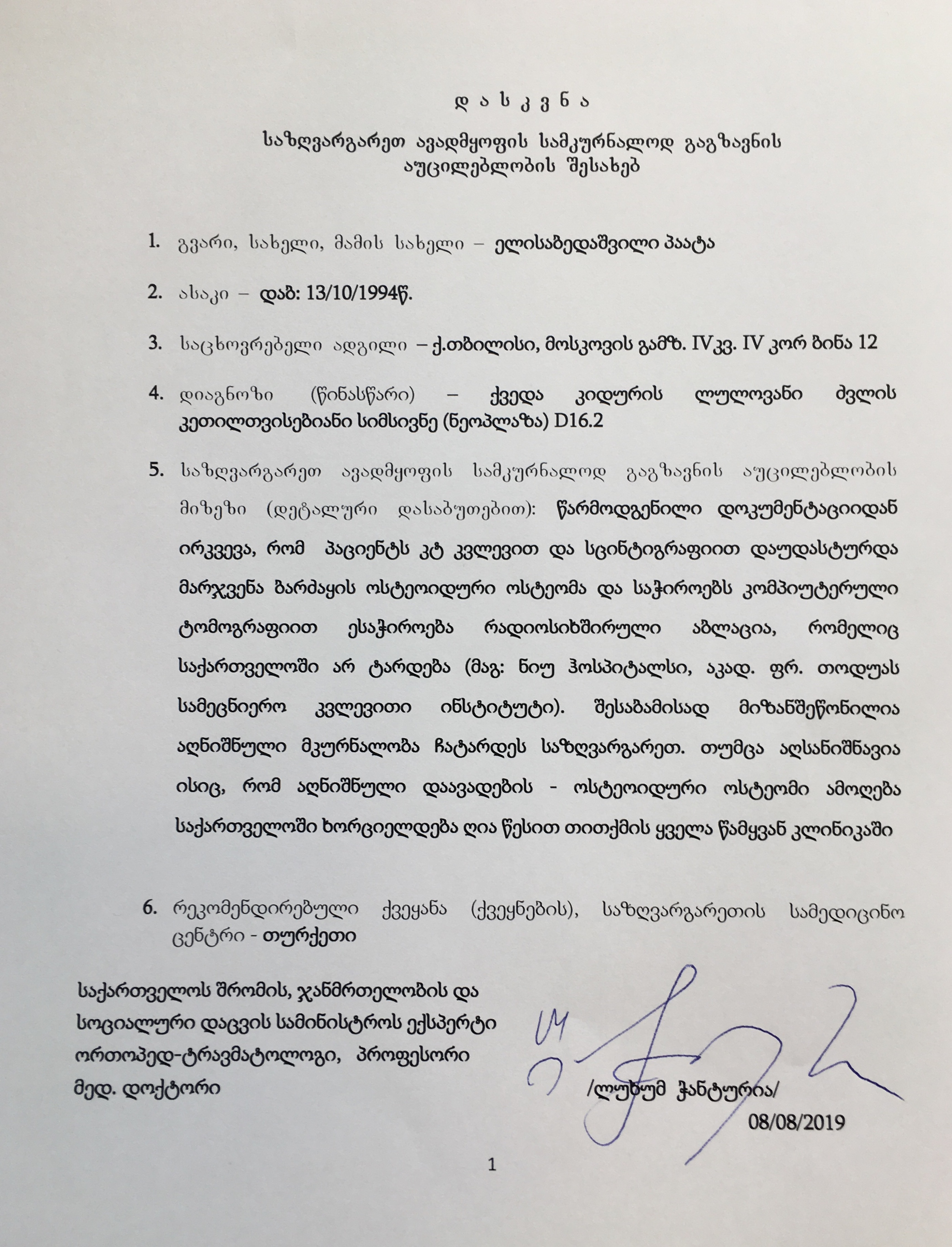 პაციენტი პაატა ელისაბედაშვილი 24 წლის ეს მისი დასკვნაა დადებითი ეხლა მოვიდა მეილზე და გთხოვთ გაითვალისწინოთ სულხან მახათაძის თხოვნაა