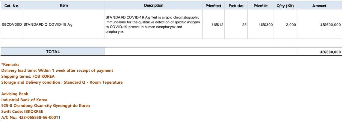 Also we discussed during last conference call, I would appreciate if you could confirm donation for STANDARD Q COVID-19 Ag/Ab Total Test.