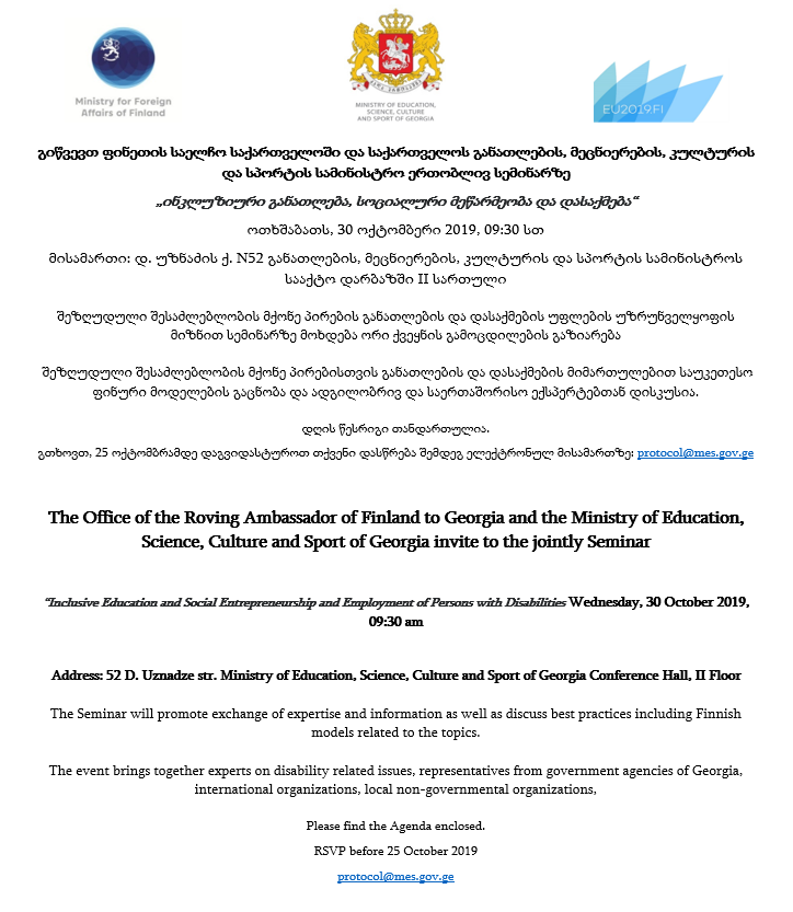 გთხოვთ, დაგვიდასტუროთ დასწრება. პატივისცემით, საქართველოს განათლების, მეცნიერების, კულტურისა და სპორტის სამინისტრო პროტოკოლის სამსახური უზნაძის ქ. 52, თბილისი 0102, საქართველო ტელეფონი (+995) 577 222 316; 599 877 121 E-mail: protocol@mes.gov.ge