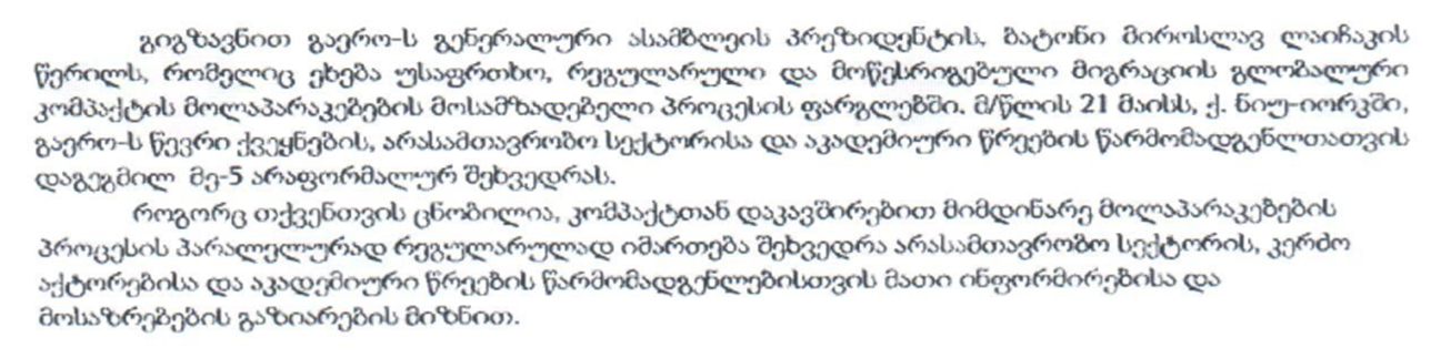 ამავდროულად სამოლაპარაკებო პროცესში უკვე ერთვება ორმხრივი ფორმატი და ქვეყნების მიერ ხდება საკუთარი პოზიციების გამყარების კუთხით პარტნიორ სახელმწიფოებთან ერთად საერთო პოზიციების შეკვრა/ჩამოყალიბება. გასულ კვირას ამგვარი თხოვნით ქ. კოპენჰაგენში საქართველოს საელჩოს მიმართა დანიის სამეფოს საგარეო საქმეთა სამინისტრომ (As promised I am forwarding you the UN zero draft document on a global compact for migration, which is to be negotiated at the UN in New York. Negotiations are starting in two weeks. The section on return and readmission is contained under objective 21 on page 22-23. In our view the wording in far from addressing the real challenges when it comes to developing more efficient return and readmission practices. It would be of great help if Georgia and other countries in your region could support the EU position. In our view, effective returns and readmission and reaffirmation of the obligation of all States to readmit its nationals without legal stay in another country, including the facilitation thereof, is an integral part of well-managed migration (safe, orderly and regular migration management).