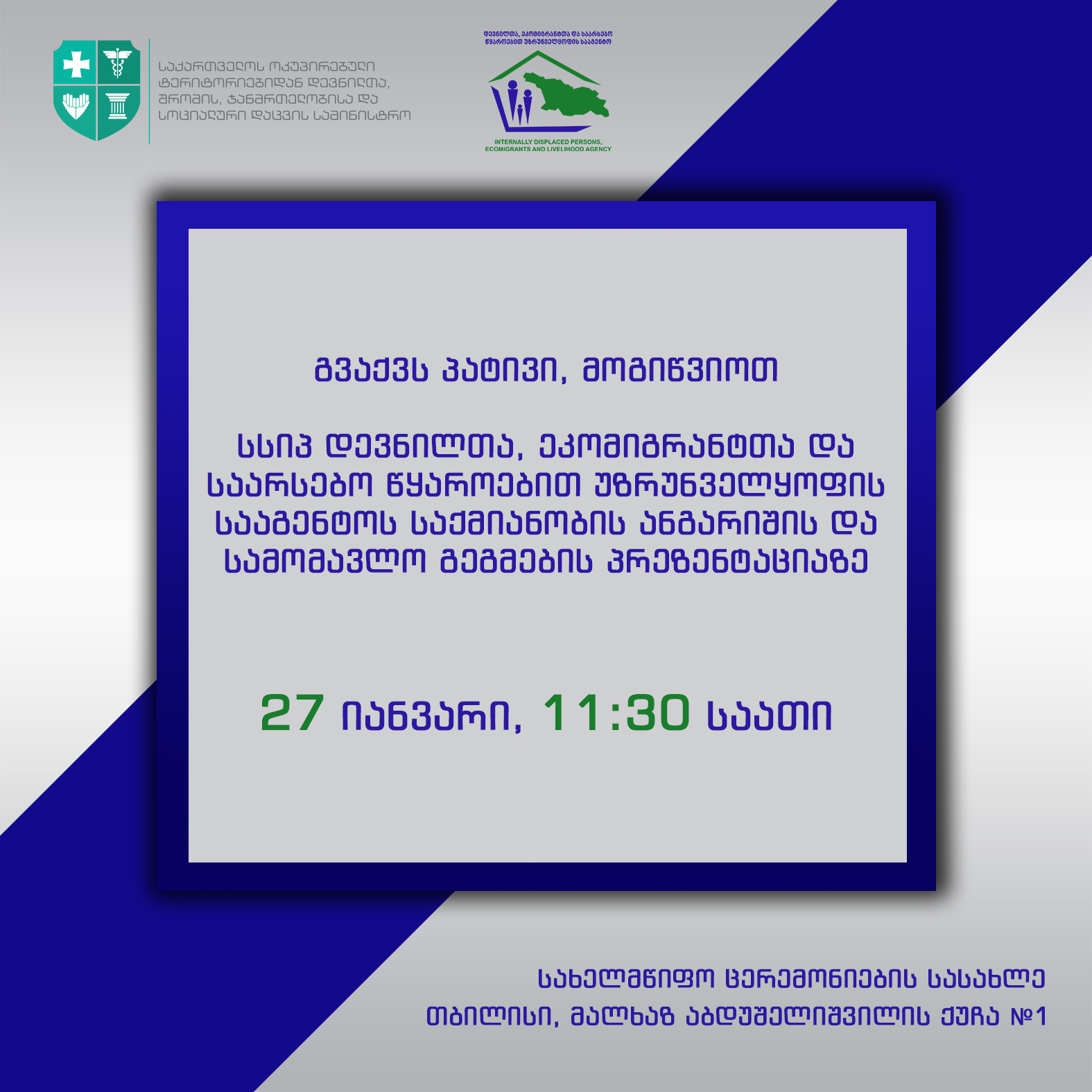 ცერემონიების სასახლეში სსიპ დევნილთა, ეკომიგრანტთა და საარსებო წყაროებით უზრუნველყოფის სააგენტოს საქმიანობის ანგარიშის და სამომავლო გეგმების პრეზენტაცია გაიმართება.