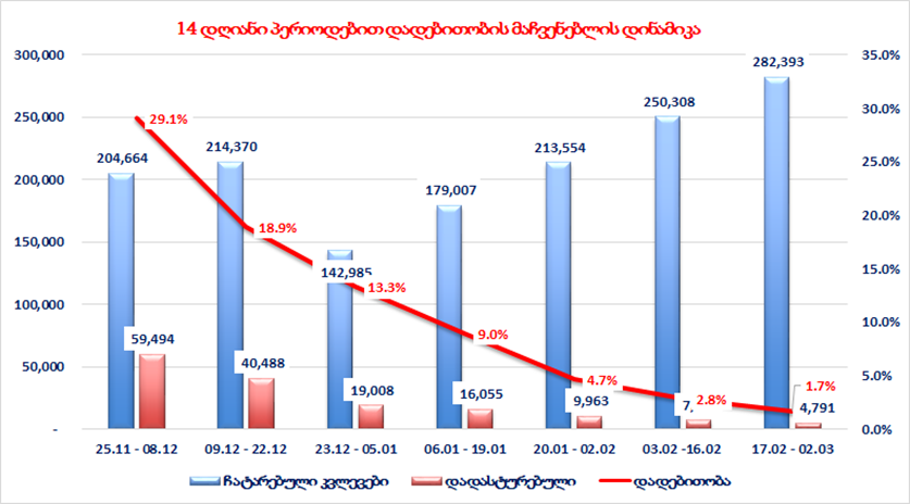 20 იანვარი - 2 თებერვალი განმავლობაში საშუალოდ დღეში აღებული იქნა 15.254 საკვლევი ნიმუში,