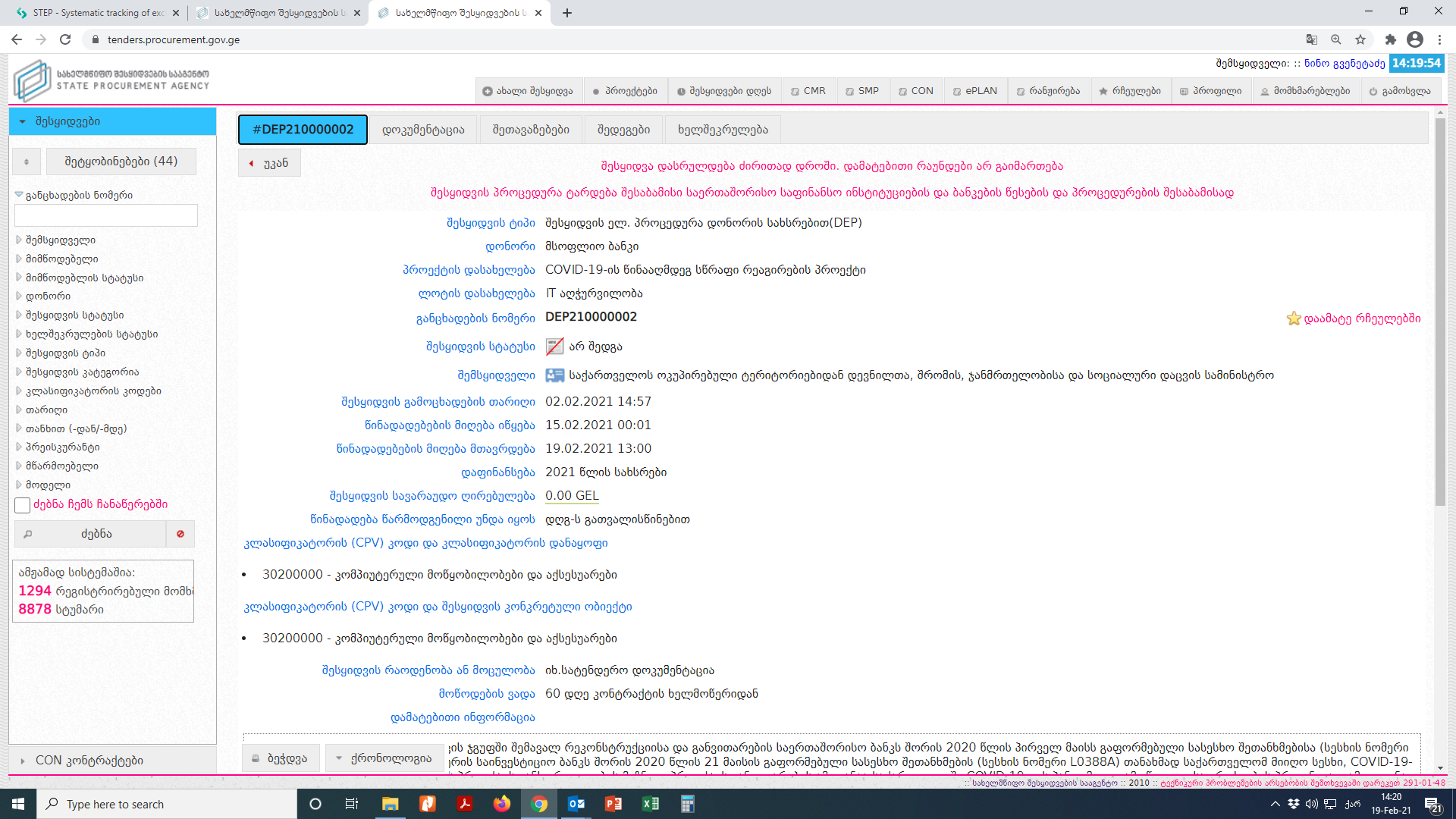 | Subject : | ტენდერი: კომპიუტერული ტექნიკის შესყიდვა - DEP210000002 - არ შედგა |