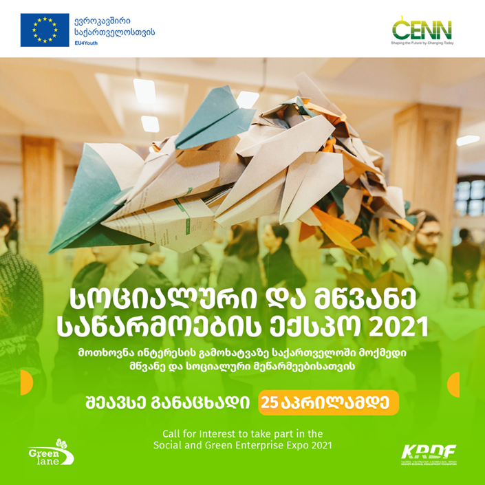 CENN, ევროკავშირის მხარდაჭერით, პროექტის "EU4Youth: სოციალური მეწარმეობის ეკოსისტემის განვითარება (SEED) მწვანე ზრდისთვის" ფარგლებში, აცხადებს რეგისტრაციას სოციალური და მწვანე საწარმოების გამოფენაში მონაწილეობის მისაღებად. გამოფენაში მონაწილეობის მიღება შეუძლიათ საქართველოში მოქმედ საწარმოებს, რომლებიც ატარებენ სოციალურ ან გარემოს დაცვით ღირებულებას და აქვთ საქმიანობის მინიმუმ 6 თვიანი გამოცდილება. დაინტერესებულმა პირებმა უნდა გაიარონ რეგისტრაცია შემდეგ ბმულზე: https://forms.gle/SsBjNugx4YQqSq9DA რეგისტრაციის ბოლო ვადა: 25 აპრილი, 2021 გამოფენა ეწყობა ევროკავშირის მხარდაჭერილი პროექტის "EU4Youth: სოციალური მეწარმეობის ეკოსისტემის განვითარება (SEED) მწვანე ზრდისთვის" ფარგლებში, რომელსაც ახორციელებს CENN პარტნიორ ორგანიზაციებთან KRDF და Green Lane (სომხეთი) ერთად. გაიგე მეტი პროექტის შესახებ: https://bit.ly/3drMUaC | CENN, with the support of the European Union, in the framework of the project ”EU4Youth: Social Entrepreneurship Ecosystem Development (SEED) for Green Growth in Borderline Communities”, announces the registration to participate in the exhibition of social and green enterprises. The exhibition is open to enterprises operating in Georgia, which carry a social or environmental value and have at least 6 months of working experience. Interested parties should register at the following link: https://forms.gle/SsBjNugx4YQqSq9DA Registration deadline: April 25, 2021 The Exposition is being organized within the ”EU4Youth: Social Entrepreneurship Ecosystem Development (SEED) for Green Growth in Borderline Communities”, which is being implemented by CENN in partnership with Green Lane (Armenia) and KRDF (Georgia). Learn more about the project: https://bit.ly/3drMUaC | |||||||||||||||