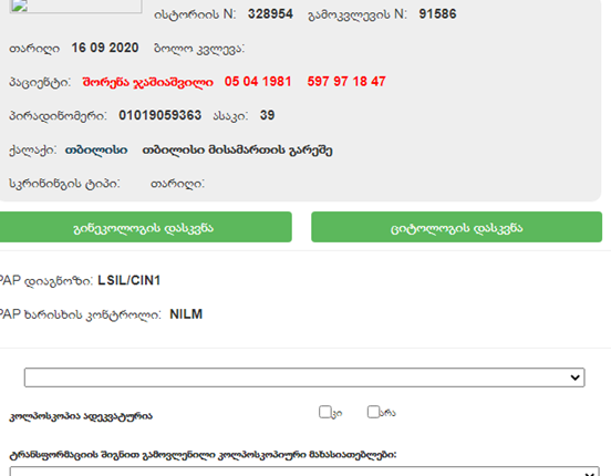 2. კოლპოსკოპისტის ანკეტას დაემატა ხარისხის კონტროლის დიაგნოზი, თუ არის, ნიმუში-პაციენტი 01022002577;