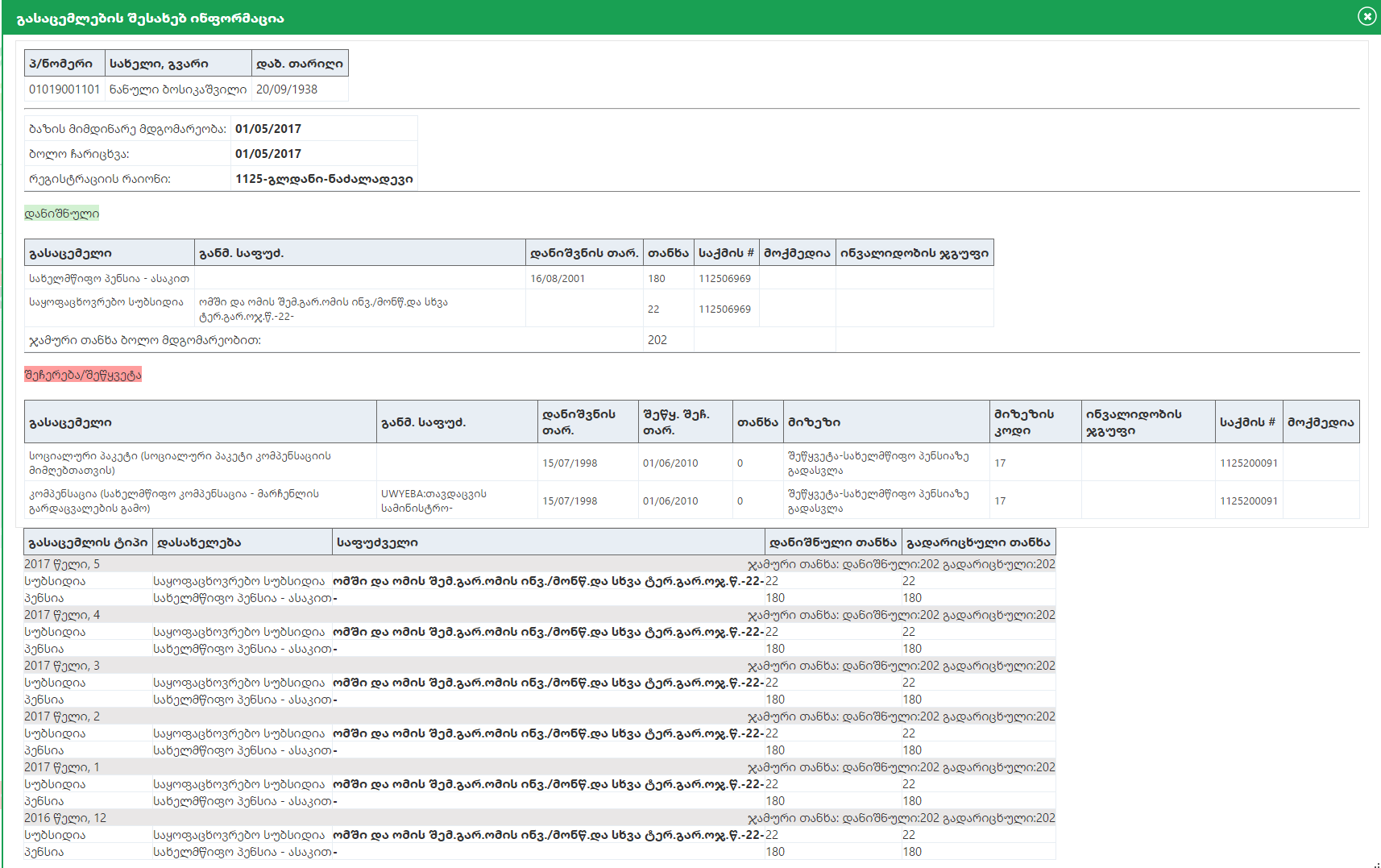 Person, Guardian, დანიშნული გასაცემლები (AssignedPayouts), ბოლო 6 ჩარიცხვა (PaymentsDetails)