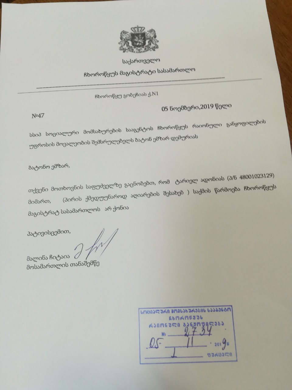 | Cc : | itabatadze@ssa.gov.ge; etskhakaia@ssa.gov.ge |